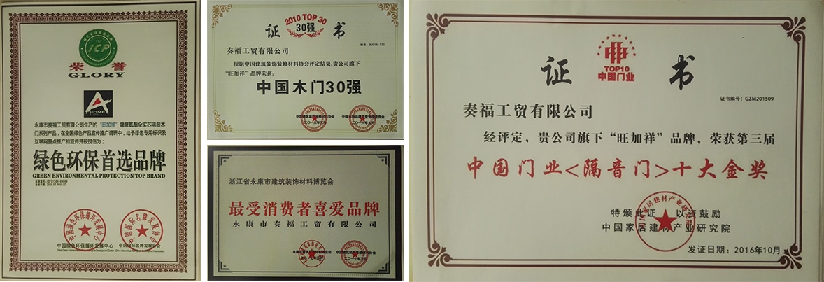 企业通过ISO9001:2000质量管理体系认证,荣获“中国著名品牌”、“绿色环保产品推介”、“中国市场放心建材产品”、“中国室内门行业市场影响力十大品牌”等荣誉。